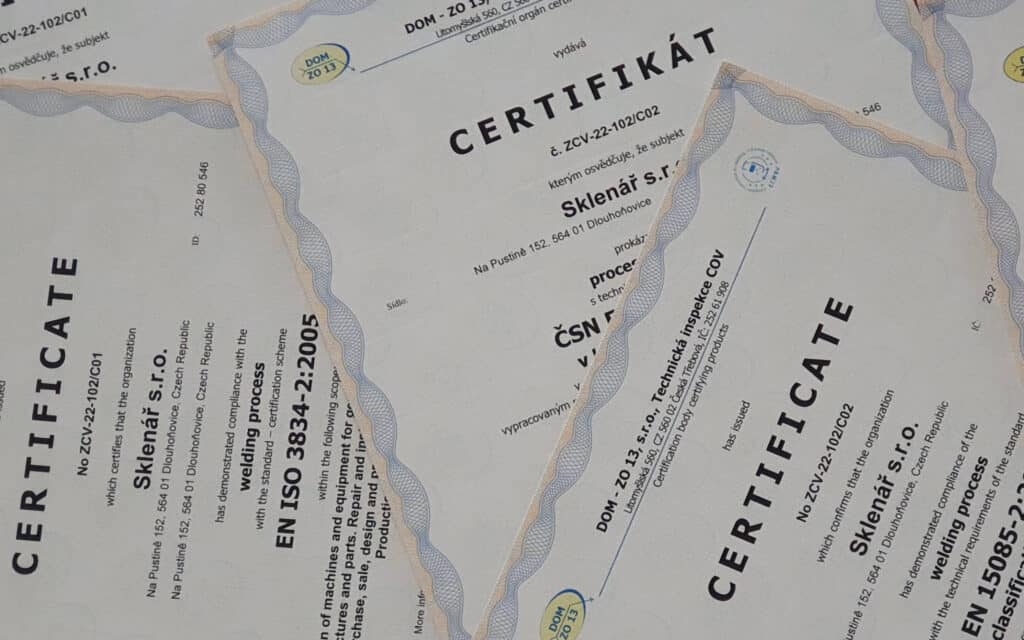 Za účelem zvyšování kvality našich výrobků a zvýšení konkurenceschopnosti jsme získali certifikáty svařování dle ČSN EN ISO 3834-2 a ČSN EN 15085-2, které budou v pravidelných termínech obhajovány.